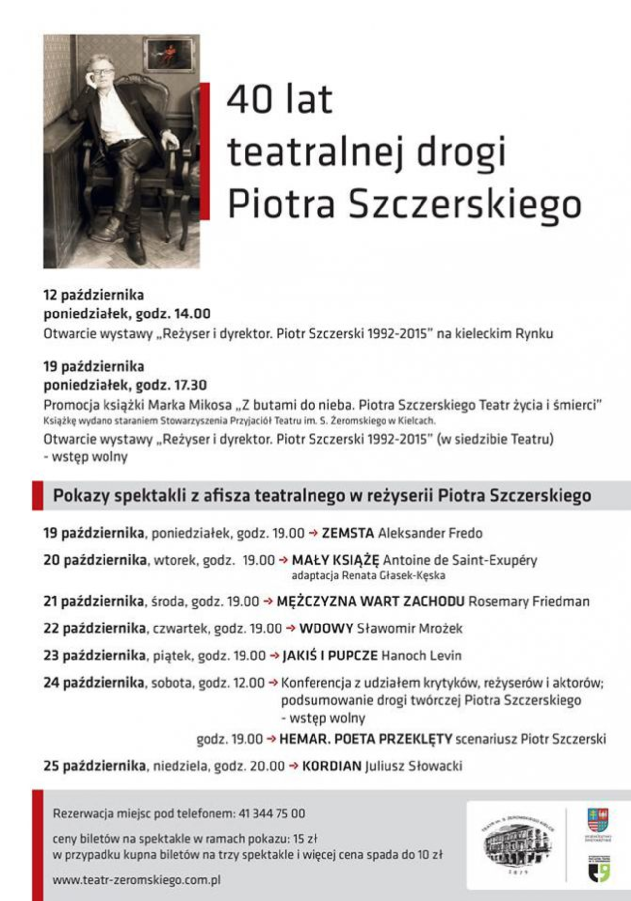 Pod takim hasłem odbędzie się szereg wydarzeń związanych z upamiętnieniem dorobku wieloletniego dyrektora kieleckiego teatru dramatycznego. Pod koniec miesiąca zaprezentowanych zostanie kilka ostatnich spektakli w reżyserii Szczerskiego. W planach jest także prezentacja książki poświęconej dyrektorowi oraz wystawa zdjęć. Odsłonięta ona zostanie 12 października na kieleckim Rynku.
