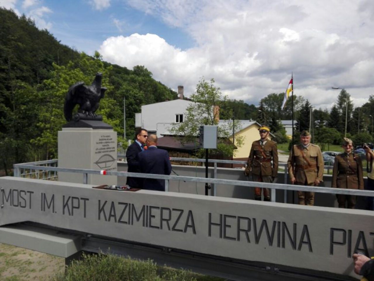 Most był poświęcony kpt. Kazimierzowi Herwinowi-Piątkowi, który w 1914 roku wprowadził do Kielc I Kompanię Kadrową. – W związku z przebudową krajowej „siódemki” budowla musiała jednak ulec zdecydowanej modernizacji. Zniknęły dwa najważniejsze elementy: belki i betonowe łuki, które nadawały całości charakterystyczny wygląd - wyjaśnia wiceprezydent Kielc, Andrzej Sygut. Jak dodaje, po rozbiórce znalazło się grono kielczan chcących utrwalić pamięć o moście i bohaterze narodowym. W efekcie powstał niecodzienny obelisk. – Po starym moście zostały dwie rozpory i walcowa podpora. Założeniem projektu było ich wykorzystanie. Powstało miejsce, w którym będzie się można zatrzymać i w przyszłości zapoznać z informacjami o bohaterze czy „Kadrówce”. Nie chcieliśmy stawiać tu wielkiego pomnika, tylko raczej zaaranżować przestrzeń - informuje rzeźbiarz Paweł Pietrusiński.