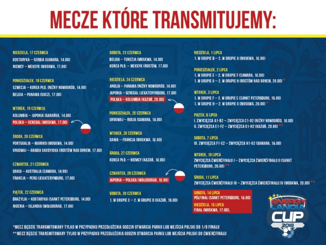 Telebim, na którym transmitowane są mundialowe mecze, znajduje się między Roller Costerami, a innymi atrakcjami Energylandii. Strefa Kibica dostępna jest bezpłatnie, dla wszystkich tych, którzy zakupili bilet wstępu do parku rozrywki.