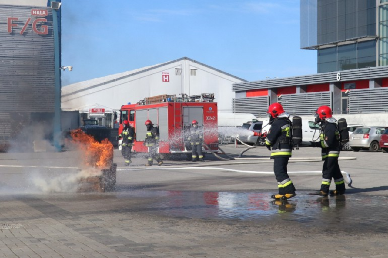 Pokaz bezpiecznego gaszenia odpadów zaprezentowali kieleccy strażacy na Targach EkoTech w Kielcach. Akcja odbyła się w ramach kampanii Biezpieczne Odpady Budowlane.