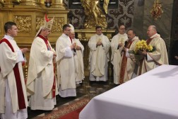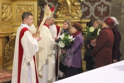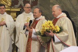 Po Mszy świętej przedstawiciele kapłanów, sióstr zakonnych oraz wszystkich wiernych wręczyli księdzu biskupowi kwiaty i złożyli życzenia.