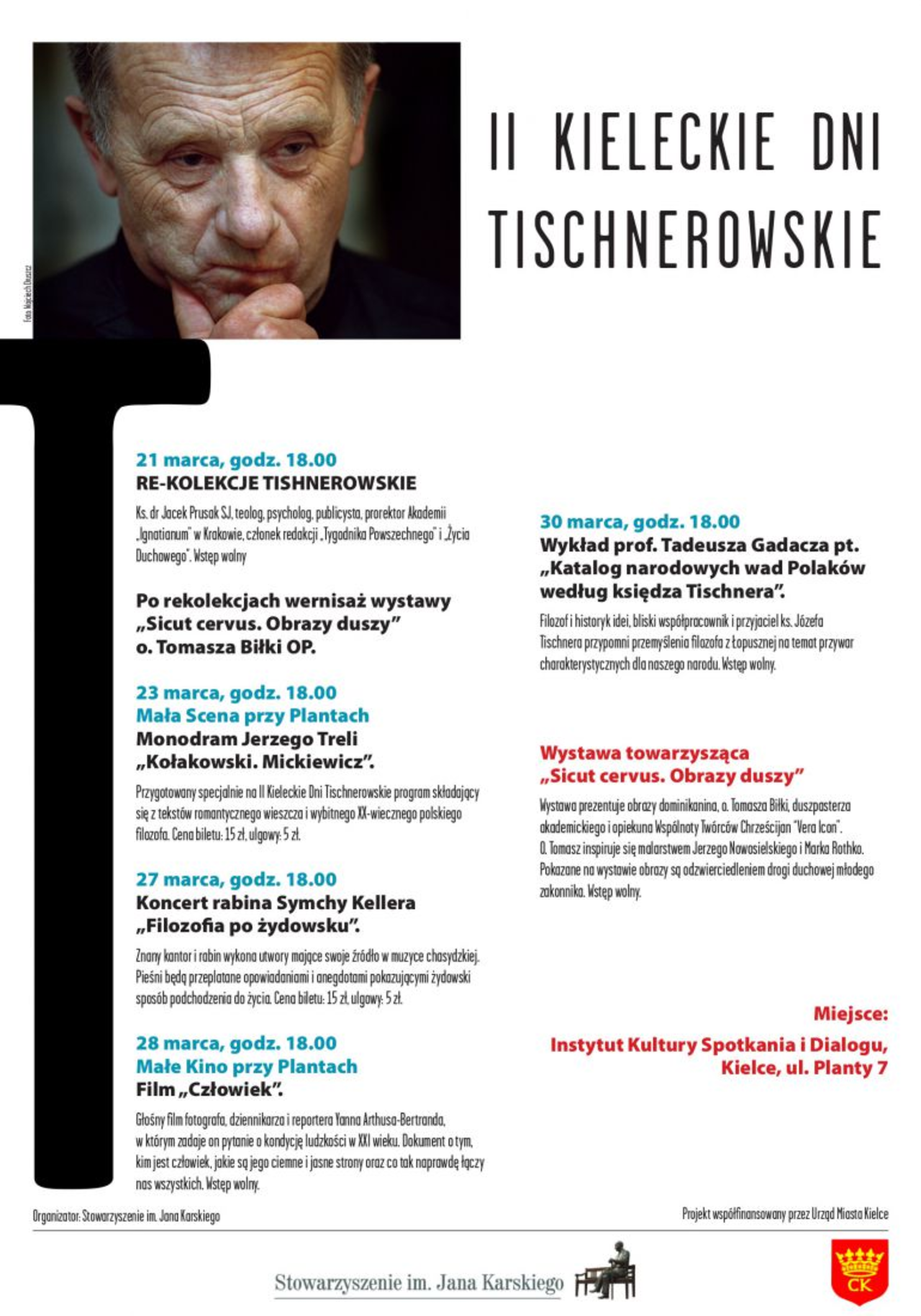 Wszystkie wydarzenia będą miały miejsce w Instytucie Kultury Spotkania i Dialogu im. Jana Karskiego przy ul. Planty 7 w Kielcach i rozpoczynać się będą o godzinie 18.00. Jedynie monodram Jerzego Treli i koncert Symchy Kellera są płatne (bilet normalny - 15 zł, ulgowy – 5 zł), wstęp na pozostałe wydarzenia jest wolny.