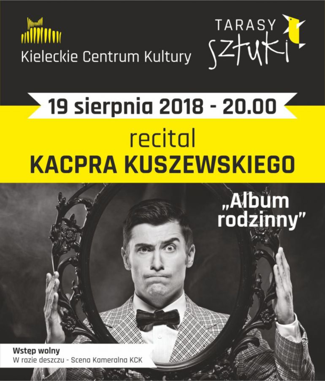 Recital Kacpra Kuszewskiego rozpocznie się o godzinie 20. W razie deszczu zostanie przeniesiony na Scenę Kameralną KCK. Wstęp jest bezpłatny, ale organizatorzy informują, że w związku z bardzo dużym zainteresowaniem "Tarasami Sztuki", w przypadku przeniesienia koncertu na Scenę KCK do wejścia na koncert upoważniać będą bezpłatne wejściówki, które można odebrać w Impresariacie Kieleckiego Centrum Kultury od poniedziałku do piątku w godzinach od 8 do 16. Jeśli koncert będzie odbywał się w plenerze, wejściówki nie obowiązują.