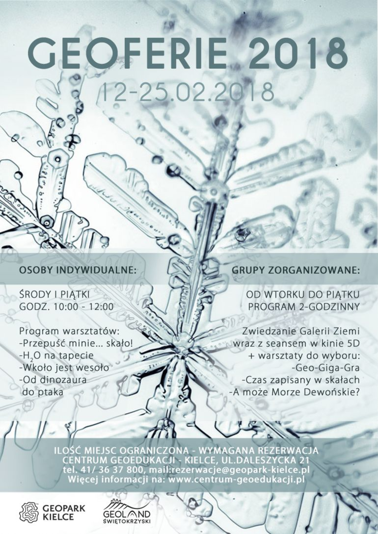 Wstęp na wszystkie geo-feryjne zajęcia jest bezpłatny, natomiast konieczna jest wcześniejsza rezerwacja: telefonicznie (041/ 36 76 800) lub drogą e-mailową (rezerwacje@geopark-kielce.pl)