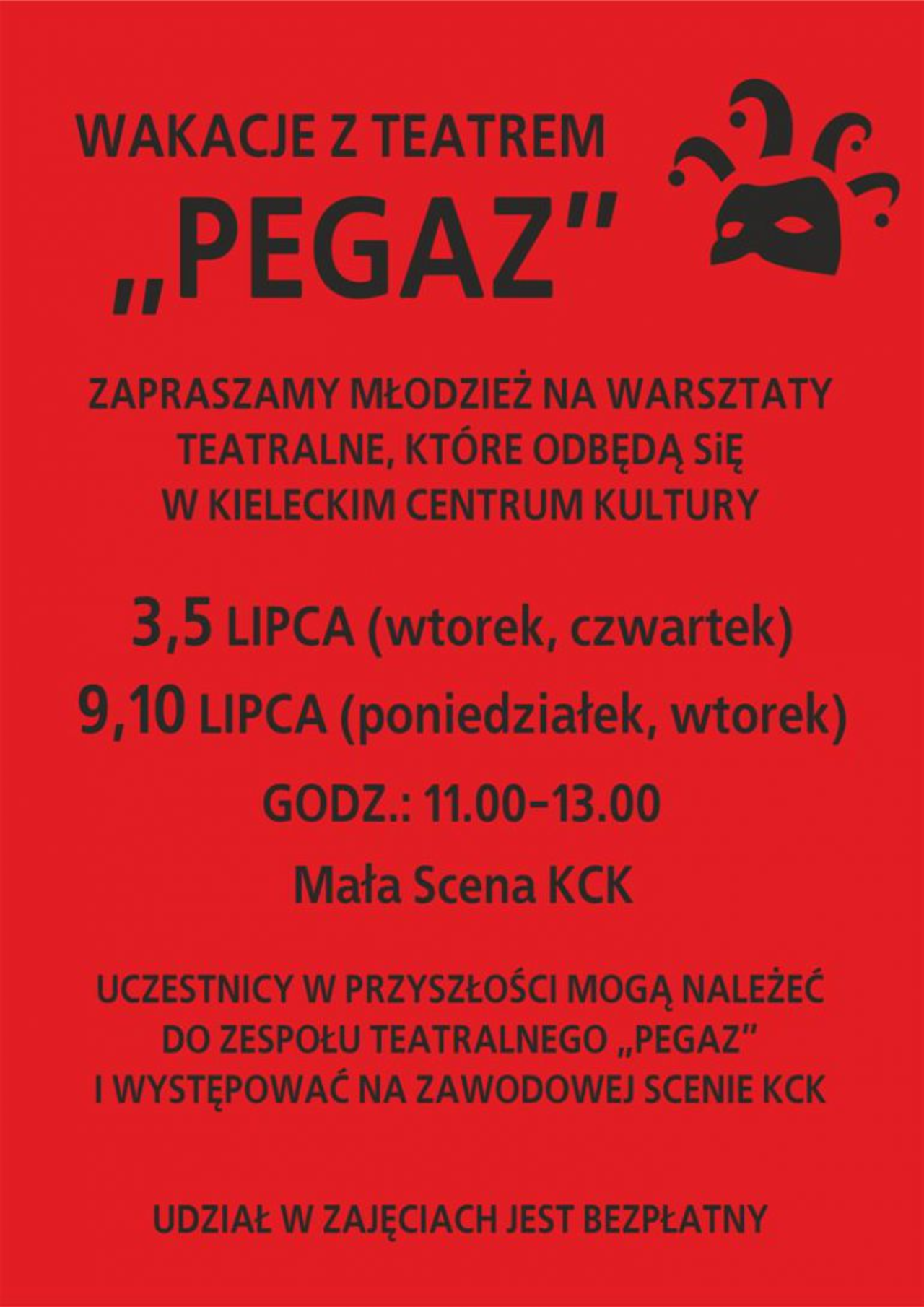 W dniach 3, 5, 9 i 10 lipca w Kieleckim Centrum Kultury, odbędą się bezpłatne warsztaty dla młodzieży.