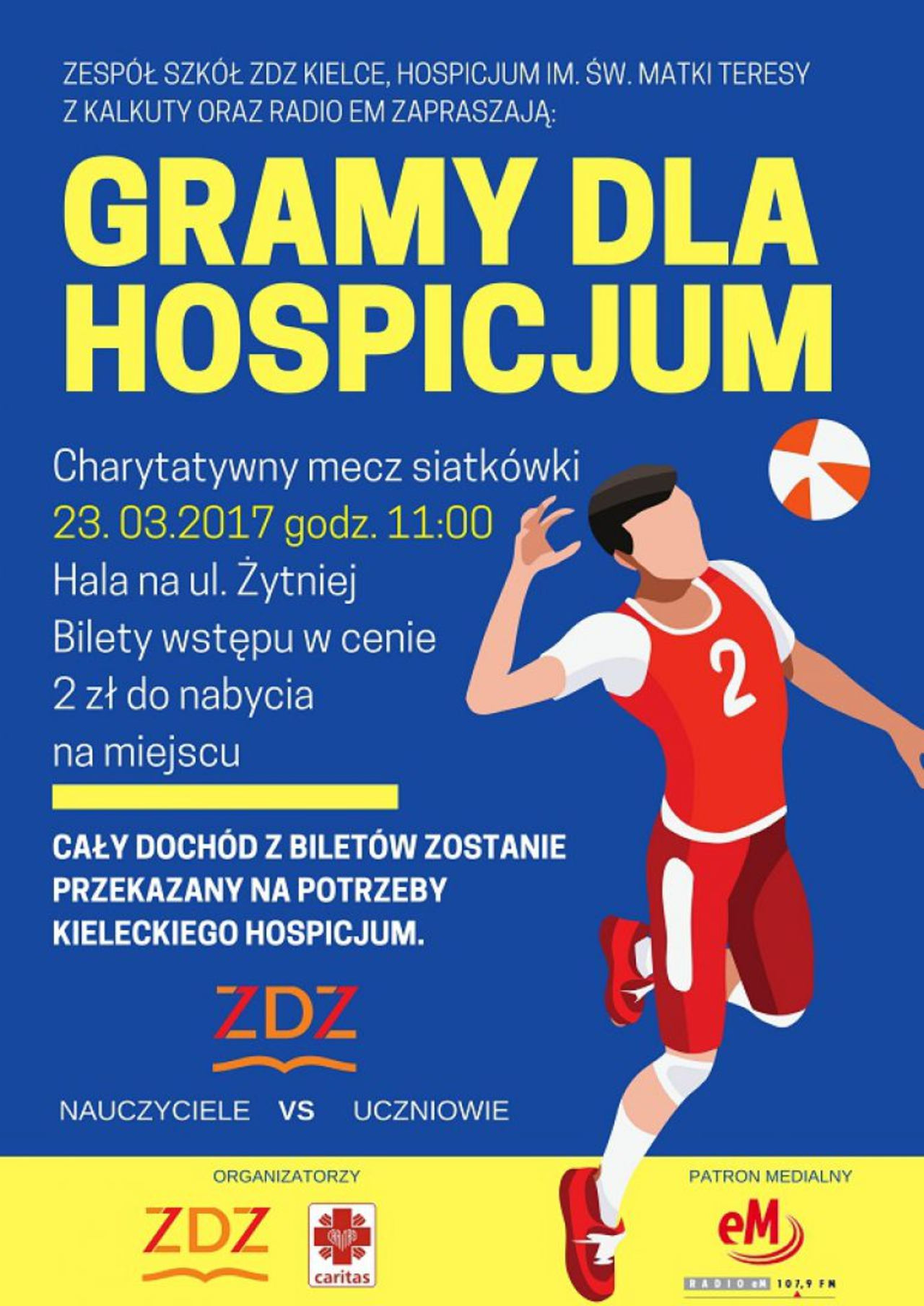 Cały dochód z imprezy zostanie przekazany na potrzeby kieleckiego Hospicjum im. Św. Matki Teresy z Kalkuty.Organizatorem wydarzenia jest kielecki ZDZ oraz Caritas. Bilety w cenie 2 zł. będzie można nabyć na miejscu. Patronat nad charytatywnym meczem siatkówki objęło Radio eM Kielce.
