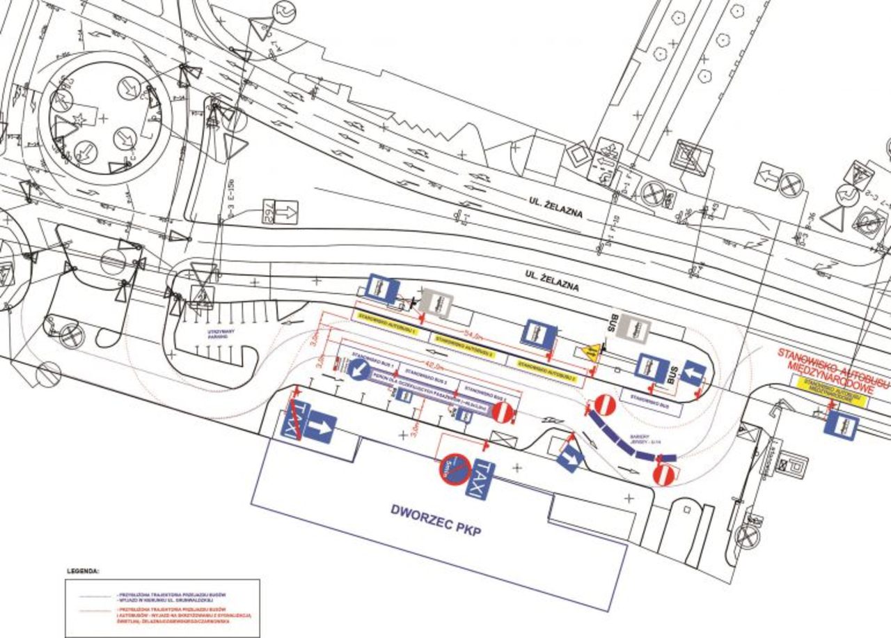 Miejsc parkingowych dla samochodów osobowych pozostanie 12 – bezpłatny postój będzie obowiązywał przez 30 minut, a dla podróżnych korzystających ze strefy Kiss&Ride maksymalny postój będzie wynosił 5 minut. W miejsce zlikwidowanych miejsc parkingowych przed dworcem PKP pojawi się tymczasowy peron. Dla potrzeb autobusów i busów wydzielono 9 oznaczonych i numerowanych miejsc odjazdowych. Wjazd na Plac Niepodległości będzie się odbywał od strony ronda przy skrzyżowaniu ulic Żelaznej, Czarnowskiej i Gosiewskiego i od strony ul. Żelaznej na wysokości poczty.