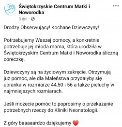 Kilka dni temu (22 czerwca) w mediach społecznościowych, na profilu Świętokrzyskiego Centrum Matki i Noworodka, pojawił się apel z prośbą o przekazanie ubranek dla maluszka w najmniejszych rozmiarach. Odzew był niesamowity...