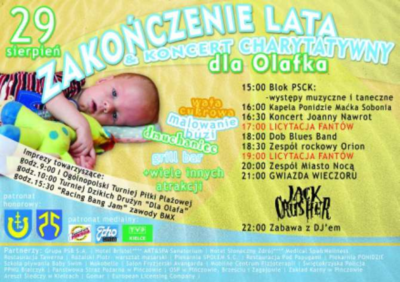 W sobotę, 29.sierpnia na terenie amfiteatru w Pińczowie odbędzie się koncert charytatywny ,,Dla Olafa” Impreza pomoże zebrać środki finansowe na rehabilitację czteromiesięcznego Olafka Adamskiego, który urodził się z miopatią wrodzoną – nieuleczalną chorobą genetyczną powodującą zanik mięśni.