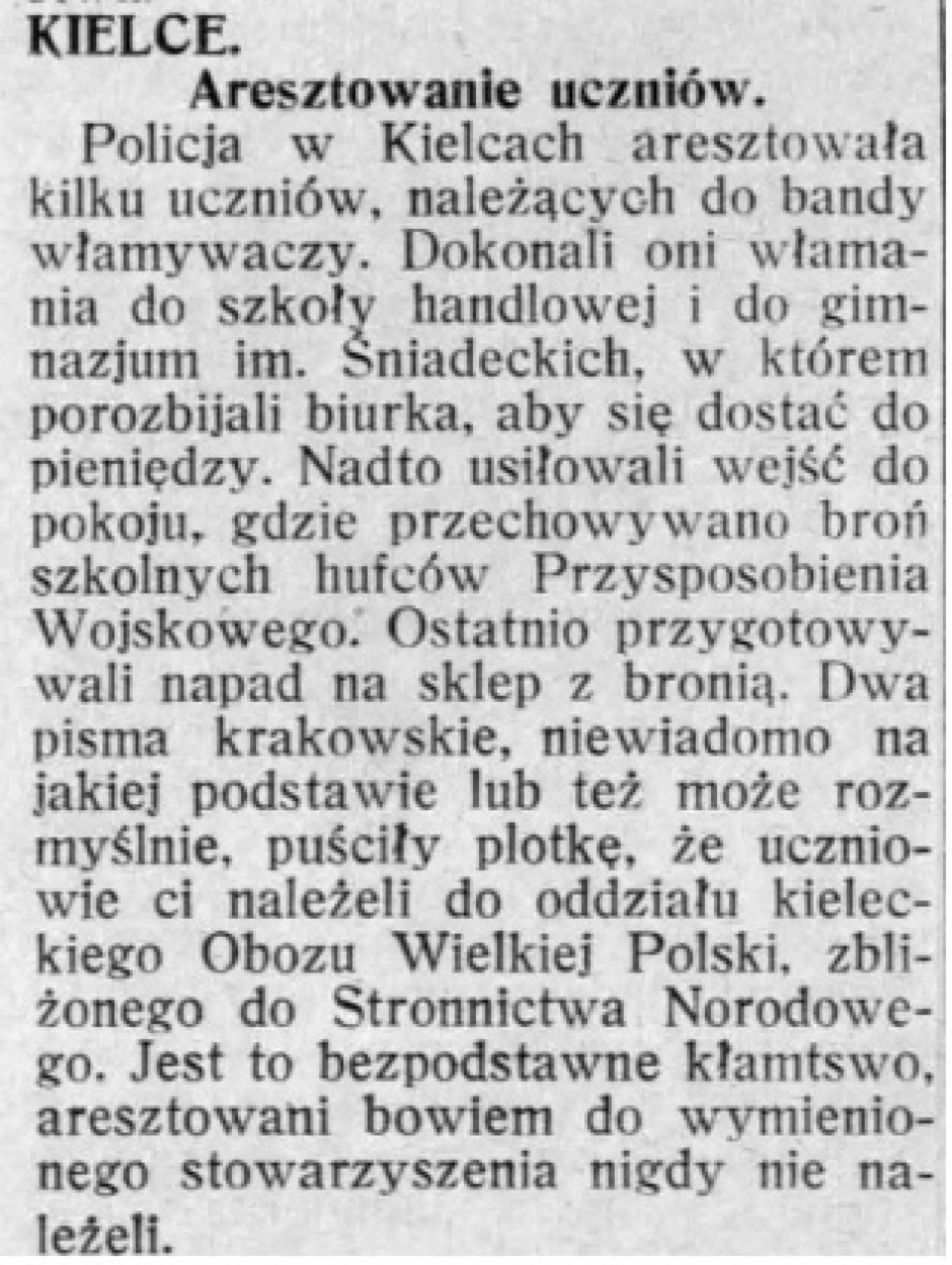 W 1931 roku w Kielcach aresztowano bowiem kilku uczniów, którzy tworzyli bandę włamywaczy. Ich celem stała się szkoła handlowa i ówczesne gimnazjum im. Śniadeckich, gdzie porozbijali biurka, w których szukali pieniędzy. Dokonali także napadu na sklep z bronią.