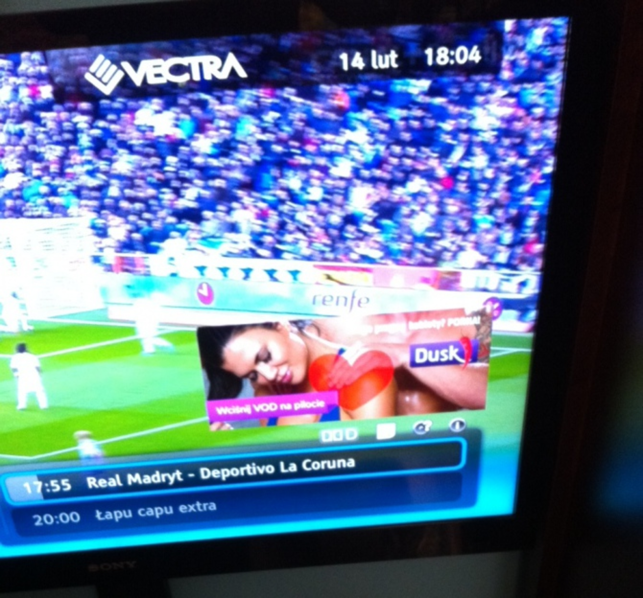 Podczas transmisji meczu Realu Madryt w Canal+ Family 2 telewizja kablowa Vectra wyemitowała własną reklamę usługi VOD, zachęcającą do zakupu treści pornograficznych. Sprawę zgłosił nam zbulwersowany tym czytelnik.