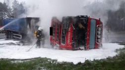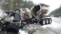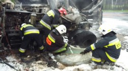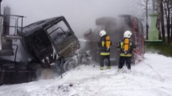 Dwa samochody cieżarowe zderzyły się na skrzyżowaniu dwóch dróg krajowych 74 i 42 w Rudzie Malenieckiej (powiat konecki). Siła uderzenia była tak duża, że oba samochody stanęły w ogniu.