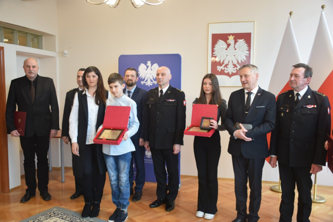 Nastolatkowie otrzymali odznaki Komendanta Głównego Państwowej Straży Pożarnej „Iuvenis Forti”. – Odznaka przyznawana jest młodym ludziom, którzy swoją wzorową, godną do naśladowania postawą przyczynili się do uratowania życia i zdrowia innych osób