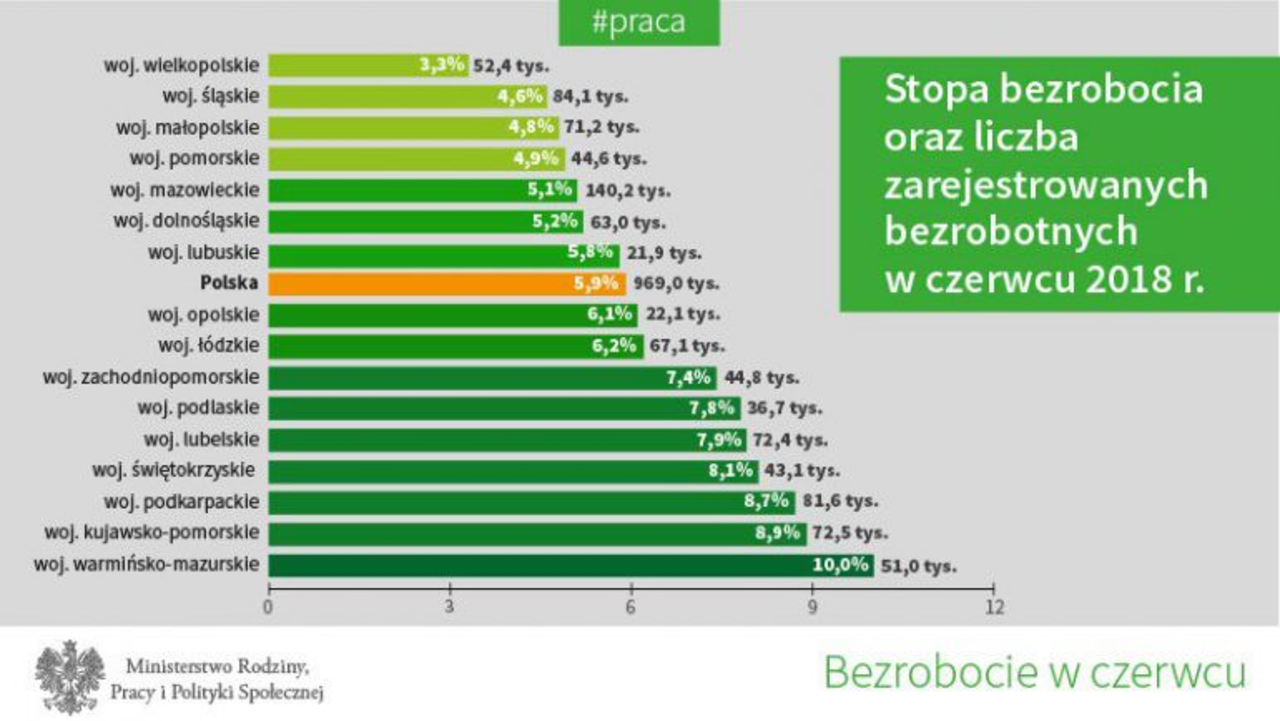 Najnowsze dane dotyczące stopy bezrobocia można zobaczyć na stronie Ministerstwa Pracy i Polityki Społecznej. W czerwcu liczba osób bezrobotnych osiągnęła rekordowy poziom poniżej miliona osób, osiągając wartość 969 tys. osób w skali kraju. Stopa bezrobocia rejestrowanego zmniejszyła się w czerwcu do 5,9 proc. z 6,1 proc. w maju. Jeszcze rok temu wynosiła 7 proc.