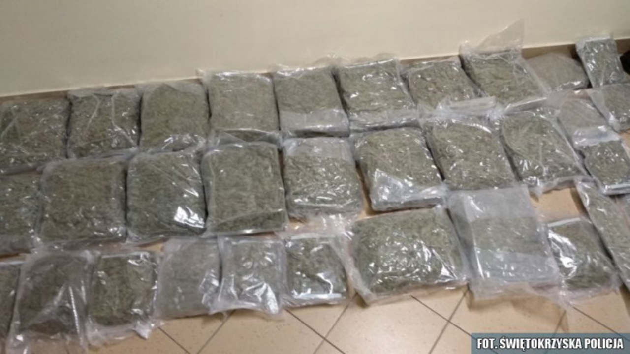 Na trop 37 i 44-latka wpadli funkcjonariusze z Komendy Miejskiej i Wojewódzkiej Policji w Kielcach. Z informacji, do których dotarli wynikało, że przez województwo świętokrzyskie przewożone mają być znaczne ilości narkotyków. Mundurowi zatrzymali do kontroli drogowej dostawczego mercedesa, którym jechali znani policjantom z przestępczej działalności mieszkańcy powiatu jędrzejowskiego. Przewozili oni 3 duże torby, w których znajdowało się kilkadziesiąt mniejszych, hermetycznie zapakowanych torebek z marihuaną.