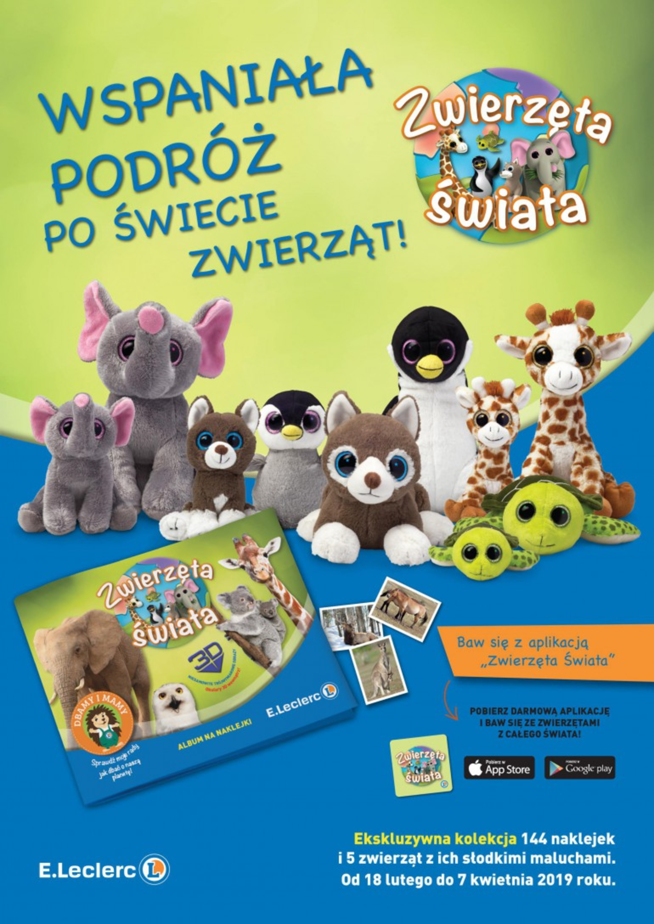 „Zwierzęta Świata” to pierwsza i zarazem największa akcja lojalnościowa realizowana przez E.Leclerc w 2019 r. Motywem przewodnim kampanii jest podróż po obu Amerykach, Afryce, Europie, Azji, Australii i Oceanii oraz odkrywanie wielu gatunków zwierząt zamieszkujących te kontynenty. Przedstawicielami poszczególnych obszarów są maskotki dostępne w dwóch rozmiarach. – Jestem przekonana, że nasi pluszowi bohaterowie będą cieszyć się popularnością wśród klientów. „Zwierzęta Świata” to nie tylko rozrywka, ale też edukacja. W specjalnym albumie do kolekcjonowania naklejek znajdziemy opisy ponad stu gatunków zwierząt oraz ciekawostki ekologiczne – mówi Patrycja Sienkiewicz-Nowak, Dyrektor Handlowy E.Leclerc.