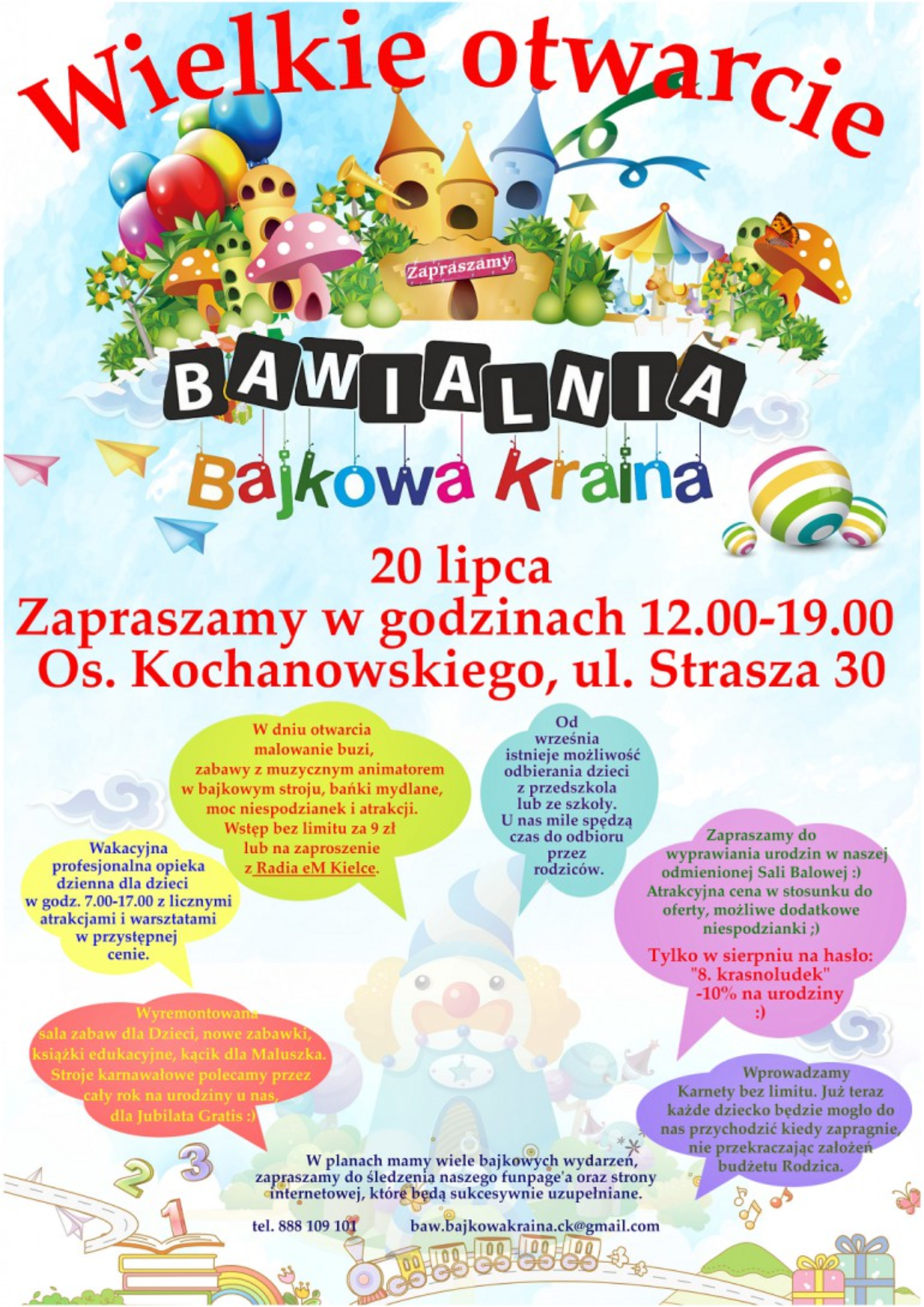 20 lipca na ul. Strasza 30 w Kielcach odbędzie się wielkie otwarcie Bawialni Bajkowa Krajna. W godzinach od 12.00 do 19.00 zaplanowano mnóstwo atrakcji.