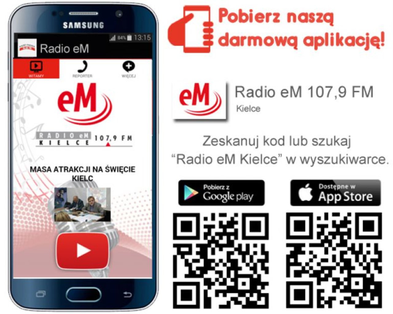 Radio eM jako pierwsza stacja w regionie wprowadziła własną aplikację na urządzenia mobilne. Aplikację „Radio eM” można pobrać z oficjalnych sklepów dla najpopularniejszych systemów operacyjnych dla urządzeń przenośnych Android oraz iOS. W aplikacji znajdziecie również najważniejsze informacje z Kielc i regionu. Już teraz zachęcamy i zapraszamy do pobrania. Radia eM można słuchać także poprzez stronę internetową rozgłośni.