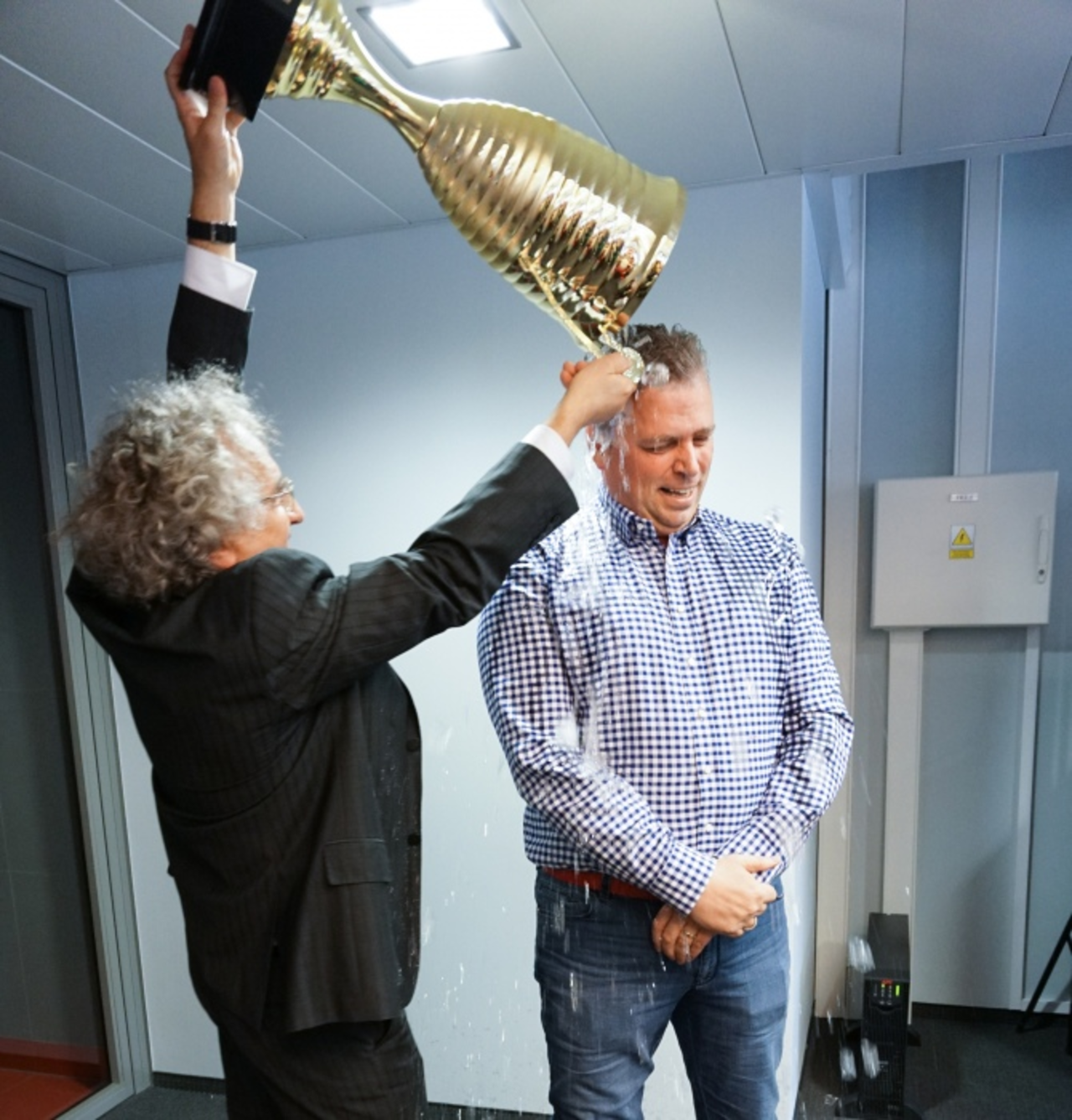 Cel? Nietypowa zachęta do przekazania pieniędzy na rzecz stowarzyszenia Dignitas Dolentium, które pomaga chorym na stwardnienie boczne zanikowe. W akcji wziął udział m.in. Bertus Servaas, właściciel firmy i klubu Vive, któremu wodę z kostkami lodu - prosto z mistrzowskiego pucharu - wylał na głowę... Andrzej Mochoń, prezes Targów Kielce.
