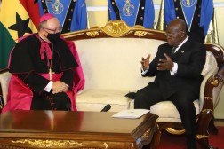 Arcybiskup Henryk Jagodziński zrelacjonował również rozmowę jaką odbył z Głową Państwa. – Pogratulowałem silnej pozycji Ghany w regionie, nie tylko ze względu na jej ekonomię, ale także, na trwałą demokrację, gdzie wyznawcy różnych religii żyją w pokojowej harmonii. Podkreśliłem wolę Kościoła Katolickiego kontynuowania swojego wkładu w rozwój społeczeństwa ghańskiego na polu edukacji i opieki zdrowotnej, oraz budowy trwałego pokoju. Zaznaczyłem, że jest to dla mnie szczególnym przywilejem móc rozpocząć moją misję w 140 rocznicę obecności Kościoła Katolickiego w Ghanie, oraz 40 rocznicę wizyty mojego rodaka w tym kraju, świętego Jana Pawła II. Pan Prezydent dziękując za pozdrowienia i serdecznie je odwzajemniając, wyraził zadowolenie z historycznych, wzajemnych relacji, szczególnie doceniając dokonania Kościoła Katolickiego na polu ochrony zdrowia i edukacji – dodaje.