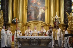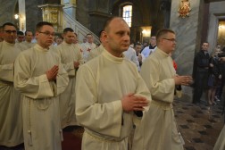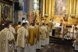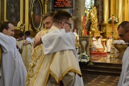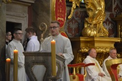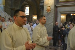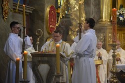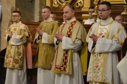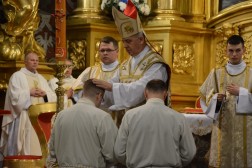 Najświętszej Ofierze przewodniczył biskup kielecki, a koncelebrowało ją kilkunastu kapłanów. W swojej homilii biskup Jan Piotrowski zwrócił się do nowych diakonów. – Pamiętajcie, że dla tych, którzy zostawiają sieci i łódź swoich ludzkich przywiązań, aby podążać za Chrystusem, Pan Jezus nie tylko obiecuje, ale daje radość nowego życia, która napełnia serce i ożywia pielgrzymowanie. Nigdy nie ulegajcie obojętności łasce miłosierdzia i zawsze tęsknijcie za tym, co czyste, dobre i szlachetne. Mimo grzechu, który gdzieś pełza w Kościele i wśród ludzi Kościoła, nie brakuje świętości, bo przecież błogosławionym jest proboszcz tej katedry, męczennik z Dachau, ks. Józef Pawłowski. To pełne świętości oddane życie tych kapłanów, którzy zostali zesłani na Sybir, cierpieli w stalinowskich obozach i tych, którzy dziś cierpią z różnych powodów. Dlatego pełni wiary nabierzcie odwagi do powierzonej wam misji. Jest z wami modlący się Kościół kielecki, wasi bliscy, rodzice, rodzeństwo, przyjaciele i seminaryjna wspólnota. W głębi serca, za świetym Piotrem, jako własne zawierzenie się Chrystusowi powtórzcie w pełnym zaufaniu: „Panie, do kogo pójdziemy? Ty masz słowa życia wiecznego, a my uwierzyliśmy, że Ty jesteś Świętym Bożym” – mówił pasterz diecezji kieleckiej.