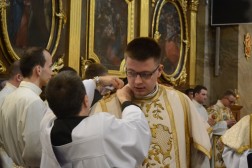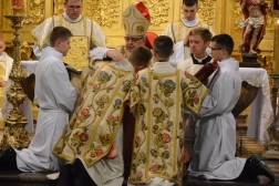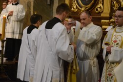Po homilii odbył się obrzęd święceń diakonatu. Kandydaci zobowiązali się „pomagać prezbiterom i przyczyniać się do rozwoju chrześcijańskiego ludu, przechowywać tajemnicę wiary w czystym sumieniu oraz tę wiarę głosić słowem i czynem zgodnie z Ewangelią i tradycją Kościoła, zachowywać celibat ze względu na królestwo niebieskie, służąc Bogu i ludziom, zachowywać i pogłębiać ducha modlitwy i w tym duchu wiernie sprawować Liturgię Godzin w intencji Kościoła i całego świata oraz nieustannie kształtować swoje postępowanie na wzór Chrystusa”. Następnie wszyscy obecni w Katedrze wzywali wstawiennictwa świętych poprzez śpiew litanii, a biskup kielecki udzielił święceń przez gest nałożenia rąk i uroczystą modlitwę, po czym nowi diakoni założyli odpowiednie szaty liturgiczne: skrzyżowaną stułę i dalmatykę. – To potwierdzenie naszego powołania, które przez pięć lat rozeznawaliśmy i uczyliśmy się, jak przygotować się do służby w Kościele. Jestem pełen nadziei, ponieważ ta chwila, na którą bardzo czekaliśmy, zmienia bardzo dużo w naszym życiu – tłumaczył Nikodem Wawrzyniak, nowy diakon diecezji kieleckiej.