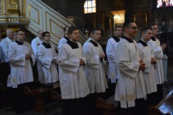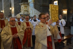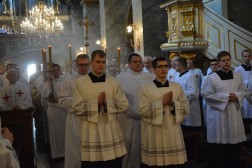 Po konferencji odbyło się wystawienie Najświętszego Sakramentu, po którym rozpoczęła się Msza Święta. Przewodniczył jej biskup Jan Piotrowski, a koncelebrowali biskupi pomocniczy naszej diecezji oraz licznie zgromadzeni kapłani. W swojej homilii pasterz diecezji kieleckiej zwrócił uwagę na ogromne znaczenie formacji kapłańskiej i wierności podczas posługi. Przedstawił również przykład bł. ks. Józefa Pawłowskiego, męczennika i proboszcza katedry kieleckiej, jako wzór do naśladowania. – To niezwykle dynamiczny kapłan w różnych formach ówczesnego duszpasterstwa, oddany animator misyjny, jałmużnik i społecznik. Charakterystycznym rysem swojej duchowości uczynił miłosierdzie. Taki też pozostał do swojej męczeńskiej śmierci w Dachau w 1942 roku – przypomniał biskup kielecki i dodał, że podstawą kapłaństwa jest gotowość do ofiary, która rodzi się z prawdy i świętości.