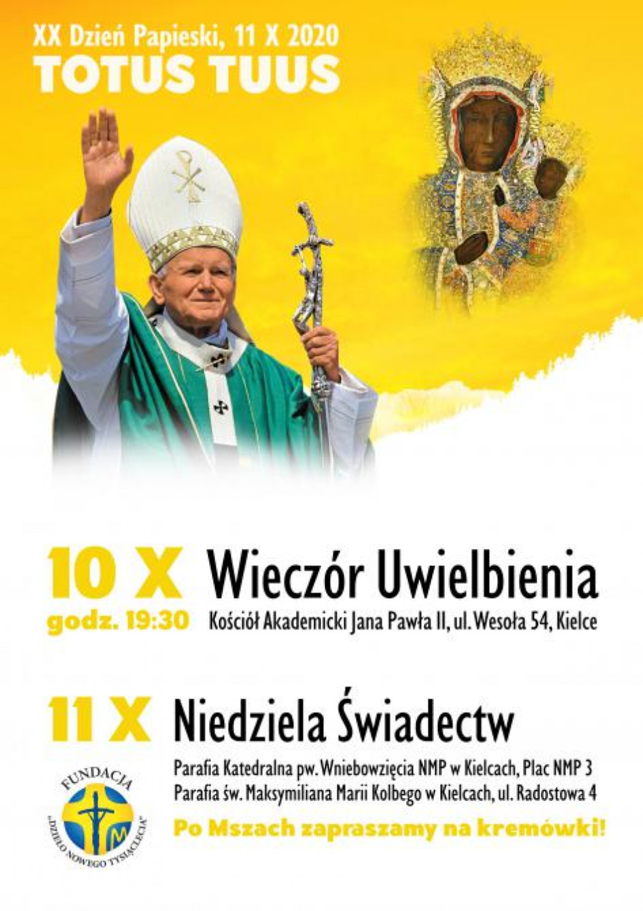 W niedzielę, 11 października, obchodzony będzie XX Dzień Papieski. Tego dnia przed kościołami wspieramy materialnie Fundację „Dzieło Nowego Tysiąclecia”, która pomaga zdolnej i niezamożnej młodzieży rozwijać swoje pasje i zainteresowania.