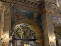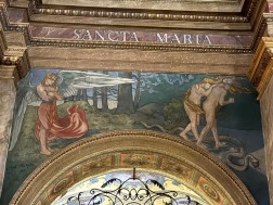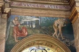 – Malowidło powstało w 1897 roku. Możemy oglądać je w nawie głównej nad jedną z arkad po stronie południowej. Jest to przepiękne przedstawienie – piękna scena, piękna kompozycja. Archanioł, który strzeże bramy do raju, ma bardzo smutną postawę – opuszczoną głowę. Widać smutek na jego twarzy, jakby nie chciał patrzeć na scenę wypędzenia pierwszych rodziców z raju. Jednocześnie przytula do siebie ognisty miecz, jakby nie chciał wyrządzić nim żadnej krzywdy. Ważną postacią tej sceny jest Ewa, która odwraca głowę w kierunku utraconego raju – z nadzieją, że być może nie wszystko jest jeszcze stracone – opisywał ks. Paweł Tkaczyk.