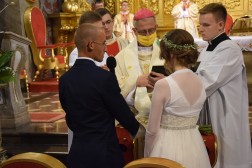 O godzinie 13 pątnicy uczestniczyli w Mszy Świętej w kieleckiej katedrze. Pielgrzymów powitał biskup kielecki Jan Piotrowski. W trakcie Eucharystii sakrament małżeństwa przyjęła para pielgrzymów. – Jesteśmy świadkami wyjątkowej uroczystości, dzięki tym dwóm, młodym ludziom, którzy wybrali ten wyjątkowy dzień, aby u stóp Matki Bożej Łaskawej Kieleckiej przysięgać sobie miłość i wierność. Niech to wasze święto sprowadzi na was obfitość Bożych łask – mówił biskup kielecki Jan Piotrowski.