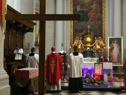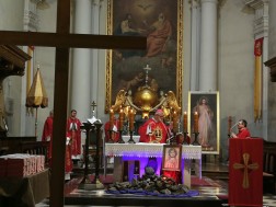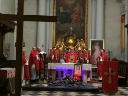 Po dotarciu na Święty Krzyż, w Sanktuarium Drzewa Krzyża Świętego odprawiona została uroczysta Msza Święta, której przewodniczył biskup Jan Piotrowski. Pasterz diecezji kieleckiej w swojej homilii odniósł się do walczących z uzależnieniami: