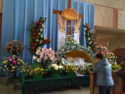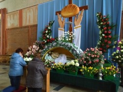 Monumentalny Grób Pański w kieleckim kościele garnizonowym wykonany został ze styropianu. Odpowiednio ozdobiony lekki materiał przypomina skały. Instalacja otacza ołtarz.