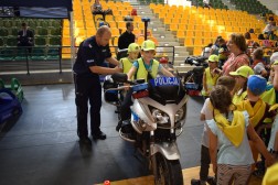 Po części oficjalnej, młodzi uczniowie mogli poznać sprzęt jakim dysponuje policja oraz zgłębić zasady bezpieczeństwa na drodze, które również dla nich stanowią ważny element codziennego życia. – Dzieci trzeba edukować od najmłodszych lat. Im wcześnie będą poznawały wiedzę, tym sprawniej ją wykorzystają. Może okazać się to przydatne również w dorosłym życiu. Cała świętokrzyska policja prowadzi cały rok, na okrągło, niezależnie od pory roku, akcje profilaktyczne, takie jak np. „Bezpieczny powrót do szkoły”, przygotowujemy dzieci do bezpiecznych ferii i wakacji – mówił aspirant Mariusz Bednarski z Wydziału Ruchu Drogowego Komendy Wojewódzkiej Policji w Kielcach. Funkcjonariusze zaprezentowali radiowozy, motocykl i stoisko profilaktyczne. Przygotowane zostały broszurki i elementy odblaskowe.