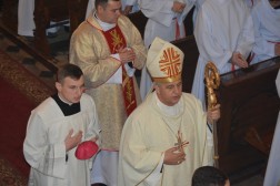 O zadaniach jakie spoczywają na lektorach mówił także ks. biskup Jan Piotrowski w swojej homilii. –Pan Jezus nie jest Pasterzem jednego sezonu. On jest zawsze, a Jego odkupieńcza miłość ogarnia wszystkich: jest niezmienna i bezinteresowna. (…). Drodzy Bracia i Siostry, a szczególnie Wy – Drodzy kandydaci do liturgicznej posługi lektora ! Wasza odpowiedź dana Jezusowi we wspólnocie Kościoła nabiera rangi świadectwa wiary i ofiary. Dajecie Panu Bogu swój czas i zdolności, aby służyć innym. Jakość tej posługi będzie ewangelicznie piękna i owocna, jeśli sami pozwolicie, aby Bóg kształtował Wasze Seca dłutem Bożej Łaski i użyźniał je pięknymi owocami dobrych uczynków – mówił biskup. - Może w oczach niektórych, nawet bliskich Wam osób nie znajdziecie uznania, ale posiądziecie skarb, którego złodziej Wam nie ukradnie, ogień nie strawi a robak nie zniszczy. Służcie Waszym parafiom, nawet jeśli to wymaga trudu i dyscypliny, ofiarowania czasu a nawet rezygnacji z bycia w tym czasie gdzie indziej. Pamiętajcie, że radosnego dawcę Bóg miłuje. To będzie Wasz kapitał na dalsze życie a może nawet i droga do wyboru powołania, według Waszego rozsądnego rozeznania. Powołania do założenia rodziny, czy bycia kapłanem diecezjalnym lub zakonnym. Miejcie pewność, że Pan Bóg da wam czytelny znak. Kochajcie liturgię, zwłaszcza Eucharystię, bowiem ona jest sercem naszego chrześcijańskiego życia. Proszę Was, abyście swoją codzienną modlitwę czynili oddechem duszy. Tylko tak nie zabraknie Wam sił na pielgrzymich życiowych drogach - zapewniał ordynariusz diecezji kieleckiej.