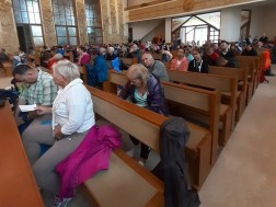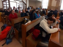 W trakcie rozważań prowadzonych przez ks. Grzegorza Stachurę, pątnicy rozważają tajemnicę Eucharystii.