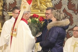 Po Mszy świętej przedstawiciele kapłanów, sióstr zakonnych oraz wszystkich wiernych wręczyli księdzu biskupowi kwiaty i złożyli życzenia.