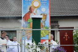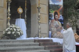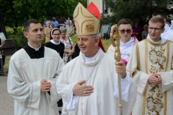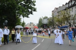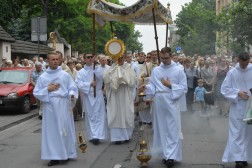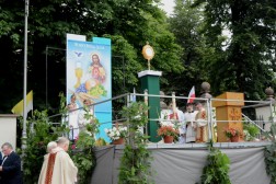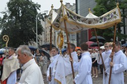 Tam biskup Jan Piotrowski wygłosił homilię, w której zauważył, że dzisiejsza uroczystość pokazuje, jak żywa jest obecność Boga wśród ludzi. – Mylił się niemiecki filozof, mówiąc o śmierci Stwórcy, który nigdy nie umiera. To jedynie ludzie umierają bez Boga. Niewolnicy ludzkiej pychy, tragarze cudzych, bezbożnych idei dalecy od prawdy, miłości i wewnętrznej wolności – mówił pasterz naszej diecezji i zwrócił uwagę na coraz częstsze przypadki ataku na wiarę we współczesnym świecie. – Jakże łatwo obraża się Boga, który objawia się nam w Jezusie Chrystusie. Jakże łatwo i bezkarnie, nie gdzieś daleko, ale już na polskiej i świętokrzyskiej ziemi, bezpardonowo obraża się ludzi wierzących, stanowiących wspólnotę Kościoła. Jesteśmy jednak dalecy od kreowania nowej epifanii zła, dlatego w naszych procesjach nie idziemy przeciw komukolwiek, ale idziemy razem z żywym Jezusem Eucharystycznym i dla Niego – tłumaczył biskup kielecki. – Eucharystia jest naszą największą świętością i nikt, i nigdzie nie ma prawa jej ośmieszać, parodiować i bezcześcić. Jej wielkości i piękna nie niweczą nawet niegodne ręce kapłana i jego niewierne serce. Jeśli się tak dzieje na polskiej ziemi, jest to znakiem upadku człowieka, a bywa, że i prowokacją chorych i bezbożnych ideologii – dodał. Biskup Jan Piotrowski zachęcił także do częstej Komunii Świętej i udziału w Eucharystii.