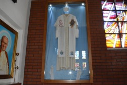 – Człowiek przechowuje zawsze na pamiątkę coś co jest związane z bliską osobą, tak aby nie zapomnieć jej. Tutaj, w Dyminach możemy zobaczyć sutannę Jana Pawła II, jedną z ostatnich, którą nosił papież, co można zauważyć po jej kroju. Przednia jej część jest bardziej wycięta na dole ponieważ Jan Paweł II był już wtedy przygarbiony i było mu ciężko chodzić. Dla nas jest to zaszczyt, że sutanna, którą nosił wielki autorytet świata jest w tej świątyni – mówił biskup Marian Florczyk.