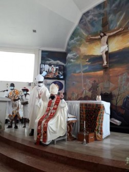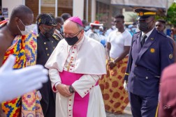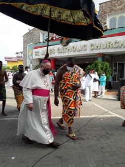"Po pozdrowieniu podano mi wodę do obmycia rąk, a następnie wytarto dłonie i stopy. Następnie dokonałem przeglądu kompanii honorowej Rycerzy i Dam Św. Jana. Podczas przemieszczania się towarzyszył nam duet dwóch tradycyjnych tancerzy, tańczących boso, w tradycyjnych strojach przy akompaniamencie tam-tamów. Po wejściu do kościoła, w prezbiterium czekał na nas arcybiskup Akry J.E. abp John Bonaventure Kwofie. Wśród kandydatów do Pierwszej Komunii Świętej było też około dziesięciu osób dorosłych.”, dodaje.
