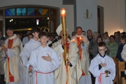 Celebracja rozpoczęła się przed kościołem parafialnym, gdzie przy ogniu rozpalono i poświęcono Paschał – symbol zmartwychwstałego Jezusa Chrystusa. Następnie, odśpiewano Exultet, czyli uroczyste orędzie wielkanocne. W trakcie Liturgii Słowa, homilię wygłosił ks. Krzysztof Jaskułka, wikariusz parafii, który zwrócił uwagę na znaczenie Triduum Paschalnego i liturgii Wigilii Paschalnej oraz na radość ze zmartwychwstania Pana Jezusa.