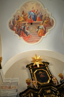 W prawej kaplicy bocznej umieszczono obraz "Zesłanie Ducha Świętego" - Postać Matki Bożej jest tam wyraźnie eksponowana. Choć zesłanie Ducha Świętego na Maryję dokonało się w czasie Zwiastowania, tutaj również podczas Zesłania Ducha świętego ten akt miał szczególne znaczenie. Maryja stała się przecież Matką Kościoła, który rozpoczynał swoje działanie własnie od tego wydarzenia - opisuje ks. prałat Pawlik. W lewej kaplicy bocznej w ramach ze sztukaterii znalazło się czterech ewangelistów z ich symbolami.