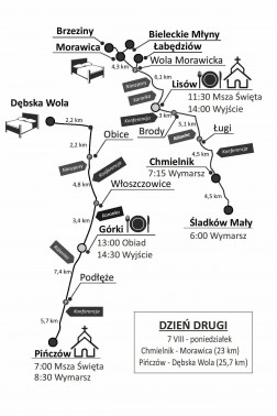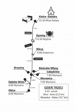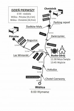 Tak jak w ubiegłych latach, na pątniczy szlak wyruszymy piątego sierpnia. Pielgrzymka rozpocznie się Mszą Świętą o godzinie 18 w Kolegiacie Narodzenia NMP w Wiślicy. Modlitwie będzie przewodniczył biskup Jan Piotrowski. Następnego dnia pątnicy wyruszą do Buska Zdroju, gdzie pielgrzymka podzieli się na dwie grupy – jedna zakończy dzień w Chmielniku, druga w Pińczowie.