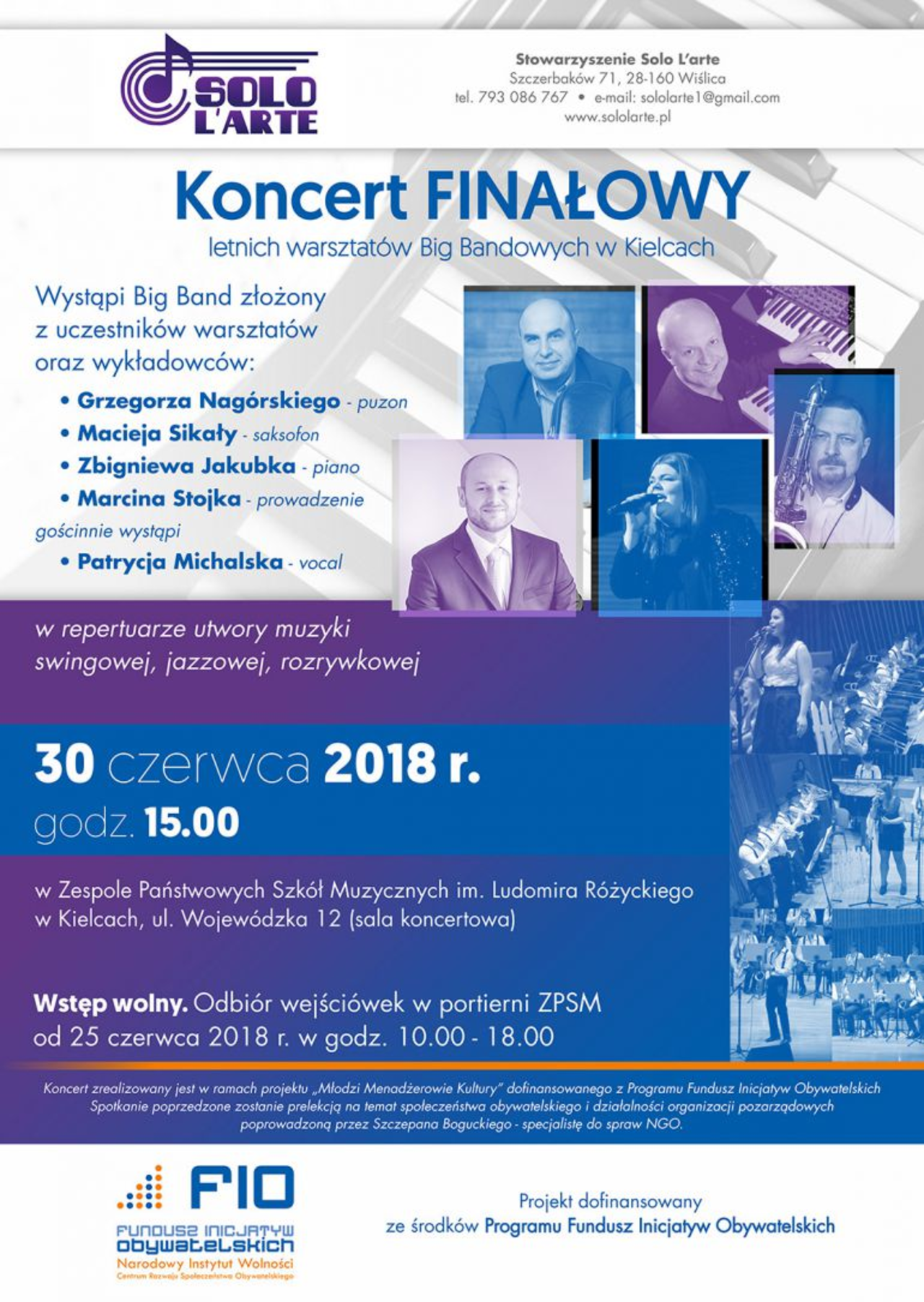 Koncert uświetnią występy wybitnych polskich muzyków, czyli Grzegorza Nagórskiego, Macieja Sikały, Zbigniewa Jakubka, Marcina Stojka, Patrycji Michalskiej. – W repertuarze pojawi się głownie muzyka rozrywkowa, jazz, standardy jazzowe. Usłyszymy też świetną wokalistkę, Patrycję Michalską. Zaśpiewa ona między innymi piosenkę „The lady is a Tramp” – mówił dyrektor stowarzyszenia „Solo l’arte”, Marcin Stojek