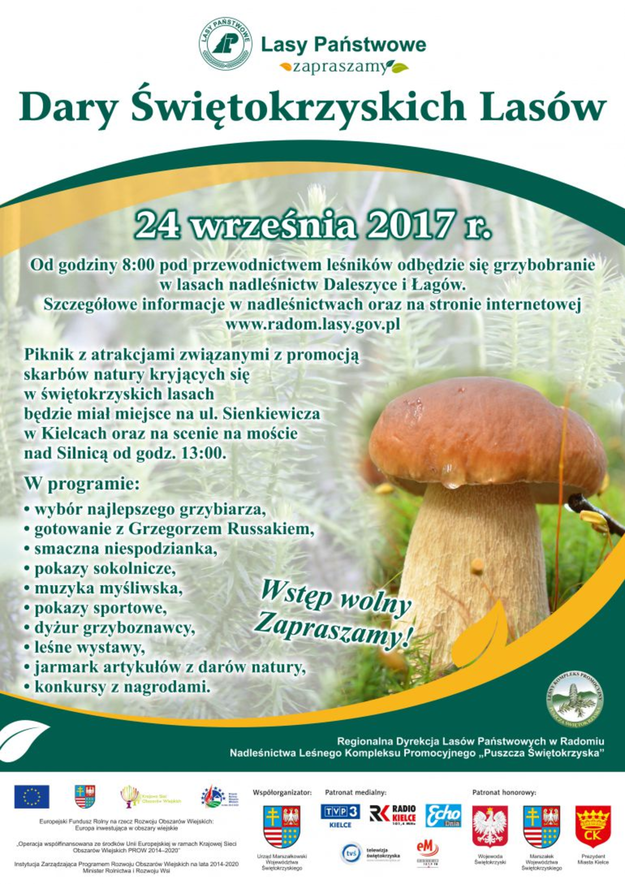 W programie znalazły się między innymi pokazy sokolnicze i sportowe, konkursy z nagrodami oraz jarmark z owocami runa leśnego. Na miejscu skonsultujemy się z grzyboznawcą. Organizatorzy przewidzieli także wspólne gotowanie z Grzegorzem Russakiem, popularyzatorem myśliwskich tradycji kulinarnych. Udział w imprezie jest bezpłatny.