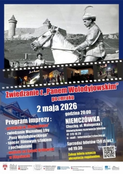 Kolejne zwiedzanie z „Panem Wołodyjowskim” po zmroku odbędzie się w sobotę, 2 maja. Rozpocznie się o godzinie 20 w zabytkowej kamienicy „Niemczówka”. Uczestnicy wysłuchają prelekcji i zwiedzą Muzealną Izby Pana Wołodyjowskiego, znajdującą się w zabytkowych piwnicach budynku, w której zgromadzone zostały pamiątki związane z planem filmowym. Następnie przejdą z pochodniami ulicami Chęcin, zatrzymując się przy miejscach znanych z ekranizacji, ale też przy ważnych zabytkach miasta. Przewodnik przybliży ich historie, odsłaniając mniej znane fakty i ciekawostki. Zwiedzanie zakończy się na Zamku Królewskim w Chęcinach.