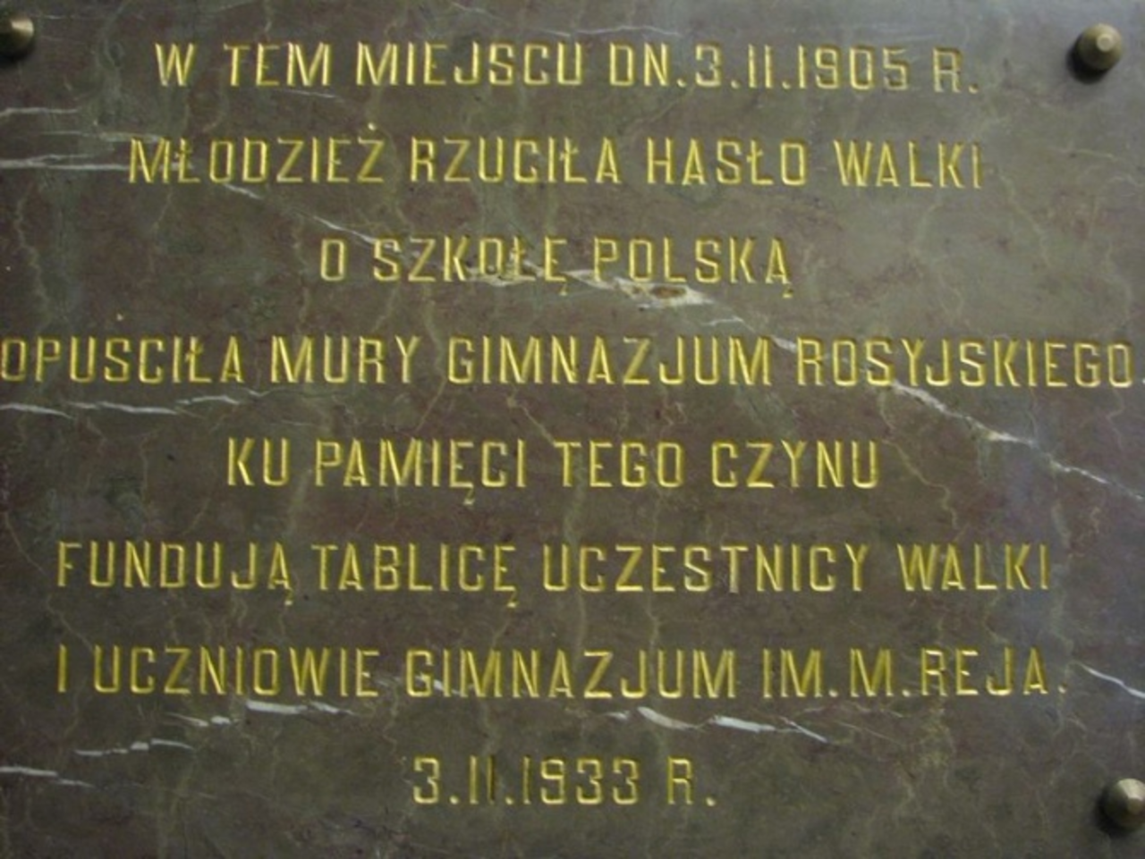 „W tem miejscu dn. 3 II 1905 r. młodzież rzuciła hasło walki o szkołę polską i opuściła mury gimnazjum rosyjskiego. Ku pamięci tego czynu fundują tablicę uczestnicy walki i uczniowie Gimnazjum im. M. Reja. 3 II 1933 r.”.