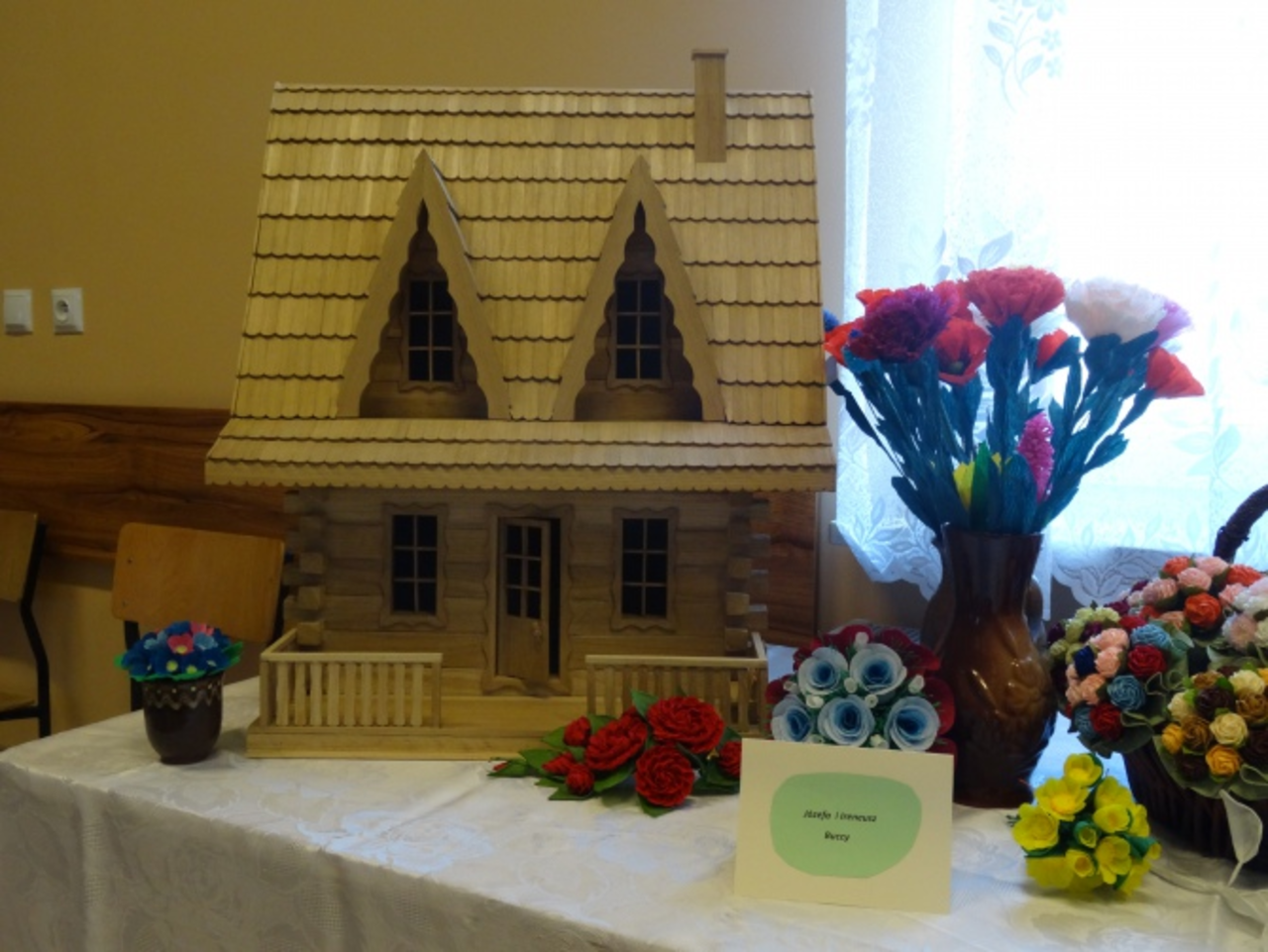 Wśród eksponatów jest m.in. miniaturowy, około półmetrowy domek z drewna autorstwa Ireneusza Buckiego. Artysta pracował nad nim ponad pół roku, a do złożenia dachu potrzeba było wykonania 837 dachówek. Nie zabraknie także dzieł Bożeny Wieczorek z Ciosowej, która wystawia obrazy olejne, haftowane, zdobione jajka i rysunki na szkle. Swoje prace prezentować będą także młodzi artyści, a wśród nich 18-letnia Aleksandra Zając, uczennica III klasy Liceum Plastycznego w Kielcach.