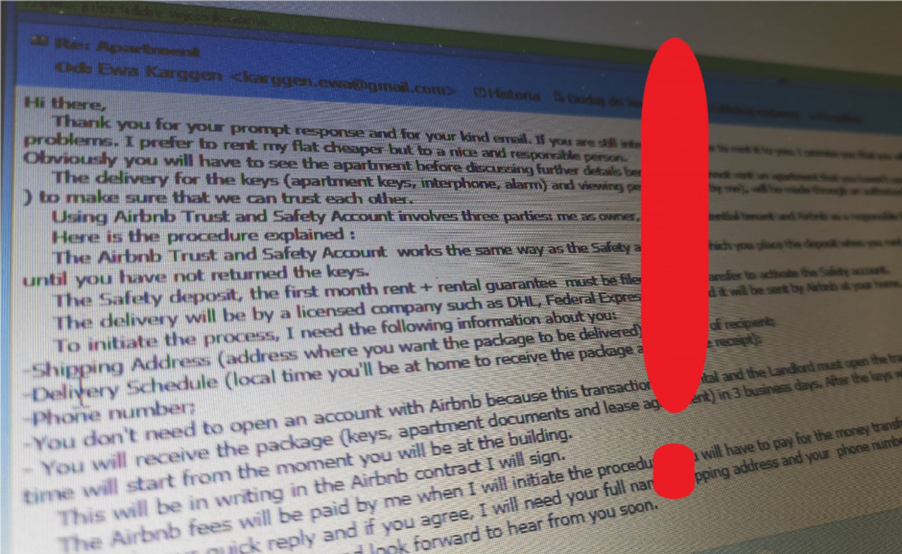 Większość ofiar chciałaby jednak obejrzeć przed transakcją mieszkanie. W kolejnym mailu znajduje się więc informacja, że klucze zostaną przesłane za pośrednictwem firmy kurierskiej po wpłaceniu zwrotnej kaucji. Gwarancją uczciwości transakcji ma być to, że obsłuży ją znany portal pośredniczący w wynajmowaniu lokali. Jeśli mieszkanie nam się nie spodoba, to oddamy klucze i dostaniemy zwrot kaucji. W rzeczywistości jednak formularz wpłaty tylko przypomina wyglądem ten, który stosuje znany portal. Wiadomość nie jest jednak wysłana z jego domeny. Po dokonaniu wpłaty kontakt się urywa, a ofiara musi się pogodzić ze stratą około 2 tys. złotych.