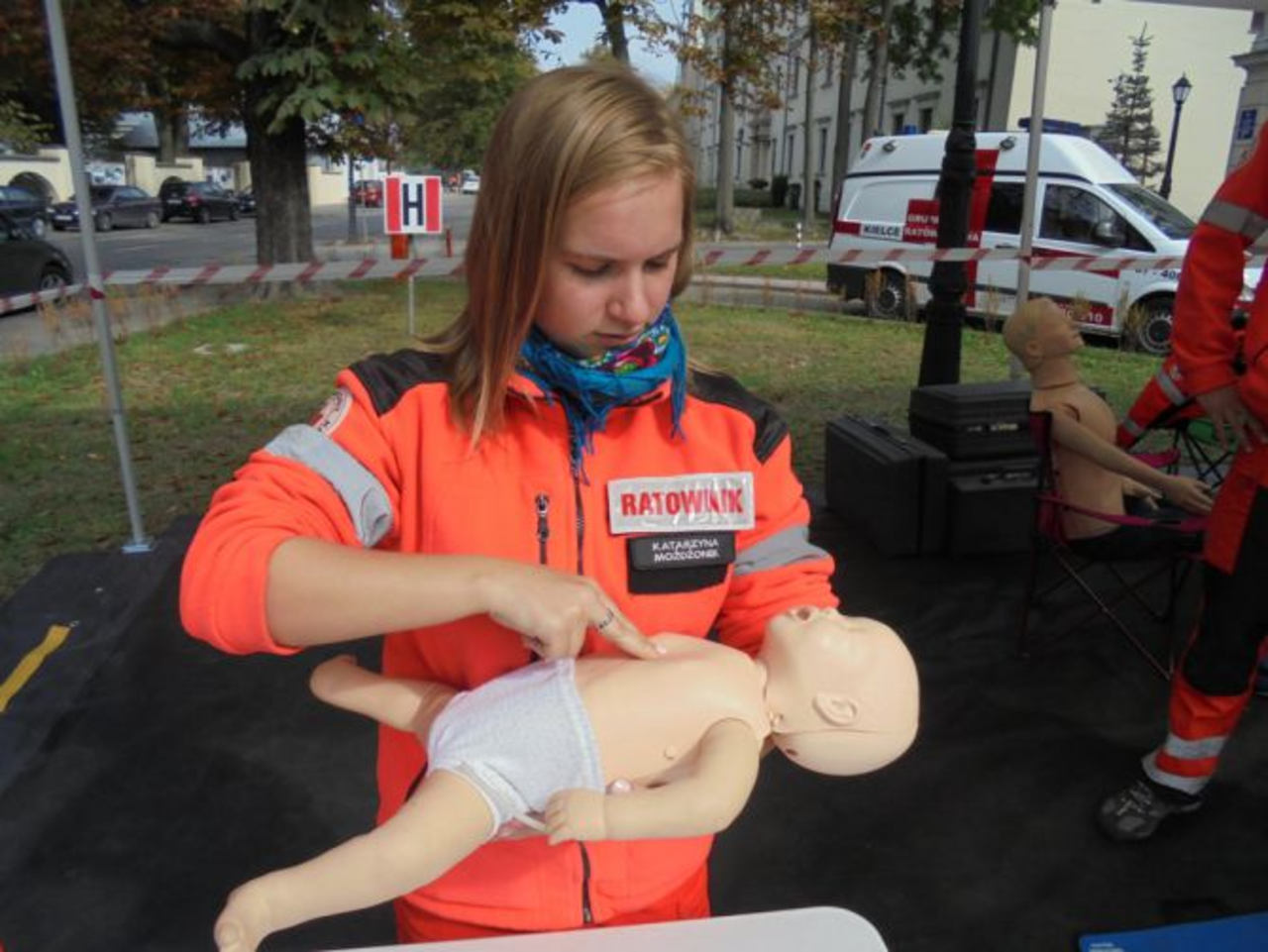 12 września to także Międzynarodowy Dzień Udzielania Pierwszej Pomocy, dlatego przed siedzibą Funduszu w Kielcach Kielecka Grupa Ratownicza PCK uczyła zainteresowanych, jak poprawnie należy udzielać pierwszej pomocy.