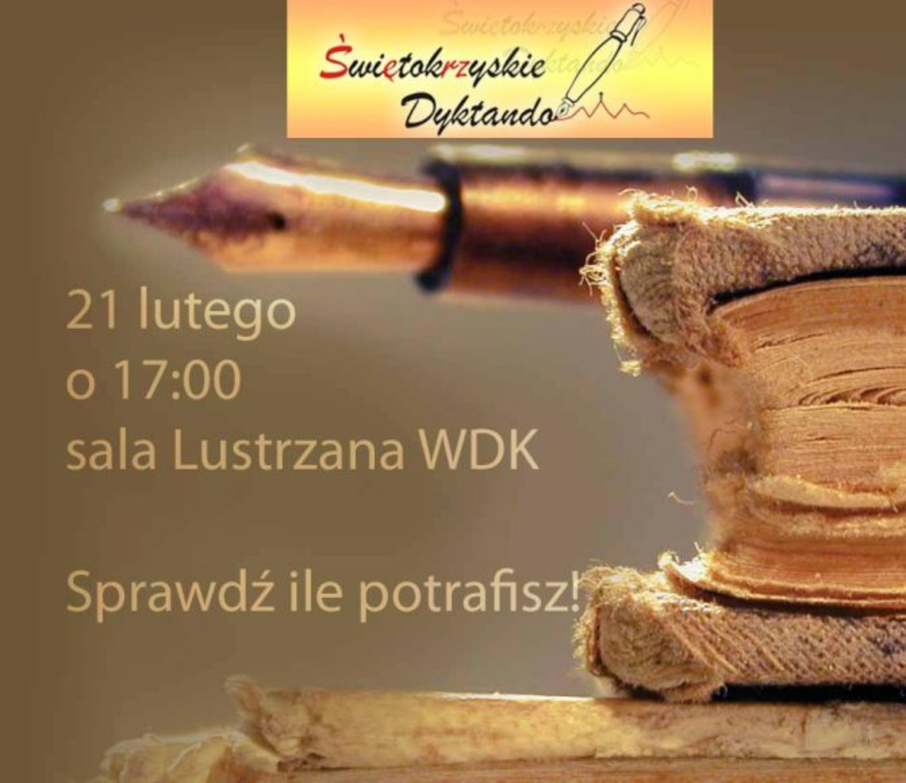 Świętokrzyskie Dyktando będzie organizowane po raz drugi, przy współpracy z Wojewódzkim Domem Kultury w Kielcach. Rejestracja zainteresowanych odbędzie się przed wejściem na Salę Lustrzaną w WDK od godziny 16:00. Za pióra chwycą o 17-tej.